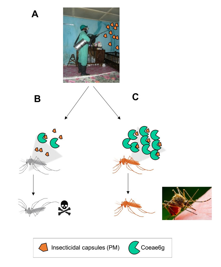 | Εικόνα 1. (A) Υπολειμματικός ψεκασμός εσωτερικών τοίχων σπιτιών με καινοτόμες μικροκάψουλες εντομοκτόνων. (B) Ευαίσθητα κουνούπια (γκρι) εκφράζουν σε χαμηλά επίπεδα το ένζυμο Coeae6g (πράσινο), και πεθαίνουν κατόπιν έκθεσης στο εντομοκτόνο. (Γ) Ανθεκτικά κουνούπια (πορτοκαλί) εκφράζουν σε υψηλά επίπεδα το ένζυμο Coeae6g, το οποίο προσδένει τη δραστική ουσία πριν γίνει τοξική για το κουνούπι. Τα κουνούπια μένουν ζωντανά, ικανά να τραφούν με ανθρώπινο αίμα και να μεταδώσουν την ελονοσία. |