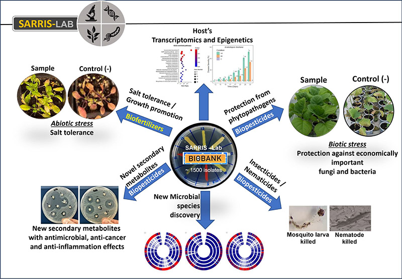 In my group we have generated a BIOBANK of more than 1500 molecularly characterized PBMs that have been isolated from CWRs (crop wild relatives) that live in extreme places (e.g. halphytes), but also from several other extreme environments (e.g. deep caves – 'Cave microbiomes'). We study the role of these microorganisms in plants' biotic and abiotic stress tolerance/resistance, but also for the identification of novel antimicrobial compounds.