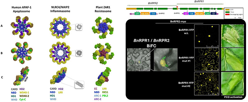 A common to plants and animals defense strategy engages intracellular immune receptors. In resistant plants intracellular receptors are encoded by Resistance (R) genes. Recent genomic studies reveal that some plants carry a repertoire of up to 100-600 different R genes. These genes mostly encode intra-cellular nucleotide-binding, leucine-rich repeat NLR (Nod-like immune receptors) proteins that resemble mammalian NLR receptors. Plant NLRs recognize specific pathogen effectors, either through direct NLR/effector binding or indirectly through the perception of effector’s function or alteration of a specific host process. R proteins activate a strong immune response known as “Effector-Triggered Immunity” (ETI). ETI in plants often leads to programmed hypersensitive cell death response (HR), which prevents further pathogen growth and spread to neighboring tissues and other plants. These immune mechanisms have been successfully described in what has become known as the “zigzag” model. However, how perception leads to defense activation and HR induction is largely unknown. This constitutes a general problem for the predictive manipulation of immunity and in immune receptors function.